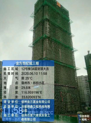 購(gòu)機(jī)客戶項(xiàng)目介紹:宿州市第六建筑安裝工程有限公司負(fù)責(zé)施工的安徽宿州金方置業(yè)有限公司12號(hào)樓34層封頂大吉。