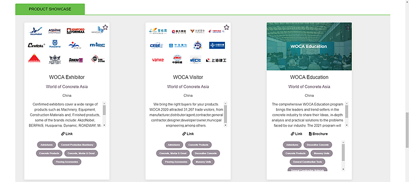 作為WOC混凝土世界系列展,WOCA亞洲混凝土世界博覽會也屆時登陸WOC線上展會向全球同仁為大家展現(xiàn)亞洲旗艦展的品牌魅力,如果您很遺憾沒有參加WOC線上展會,沒關(guān)系,凡是已參與WOCA 2021的展商都將獲得曝光!(下圖為WOC線上展會)