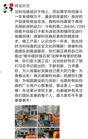 科瑪森作為生產(chǎn)廠家看到客戶美好發(fā)展與財(cái)富增值,心里特別高興,看到自己制造出來的細(xì)石泵能高度被認(rèn)可心里十分欣慰,科瑪森科技創(chuàng)新驅(qū)動(dòng)發(fā)展戰(zhàn)略-----高端機(jī)型、企業(yè)品牌越來越好!科瑪森深深感謝大家支持---做中國好細(xì)石泵民族品牌!