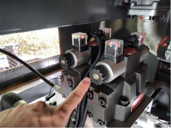 4、檢查閥芯是否卡死,電磁閥是否有問(wèn)題。閥芯卡死分為電磁閥卡死和換向閥卡死。頂住溢流閥閥芯不松手,再用小螺絲刀或小內(nèi)六角分別頂兩個(gè)電磁閥上的4個(gè)閥芯。能輕松頂動(dòng),并有相對(duì)應(yīng)的左右擺動(dòng)或者前進(jìn)、后退動(dòng)作,說(shuō)明閥芯未卡死。