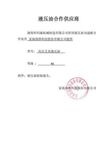 綜上所述可以看出液壓油對(duì)于混凝土輸送設(shè)備來說猶如血液對(duì)人的重要性,是必不可少不可或缺的。湖南科瑪森機(jī)械設(shè)備有限公司在液壓油的選擇方面更是極其重視嚴(yán)苛??片斏x擇了中外合資的富地潤滑科技有限公司提供的高級(jí)高壓無灰液壓油46#。這款液壓油在耐高溫、抗泡性以及抗乳化性方面都特別強(qiáng)。