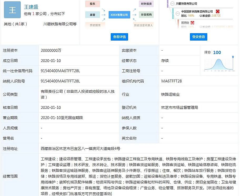 記者從國家企業(yè)信用信息公示系統(tǒng)了解到,川藏鐵路有限公司已于2020年1月10日成立,注冊資本2000億元,注冊地點(diǎn)位于西藏自治區(qū)林芝市,中國國家鐵路集團(tuán)有限公司持有其100%股份。